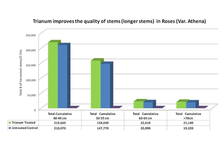 The same study also showed a notable increase in the total number of harvestable stems and a general increase in the stem length profile, specifically in stem lengths 50-59cm (0.4%), 60-69cm (0.3%) and 70-79cm (0.1%) in the TRIANUM treated rose crop compared to the standard comparison area.