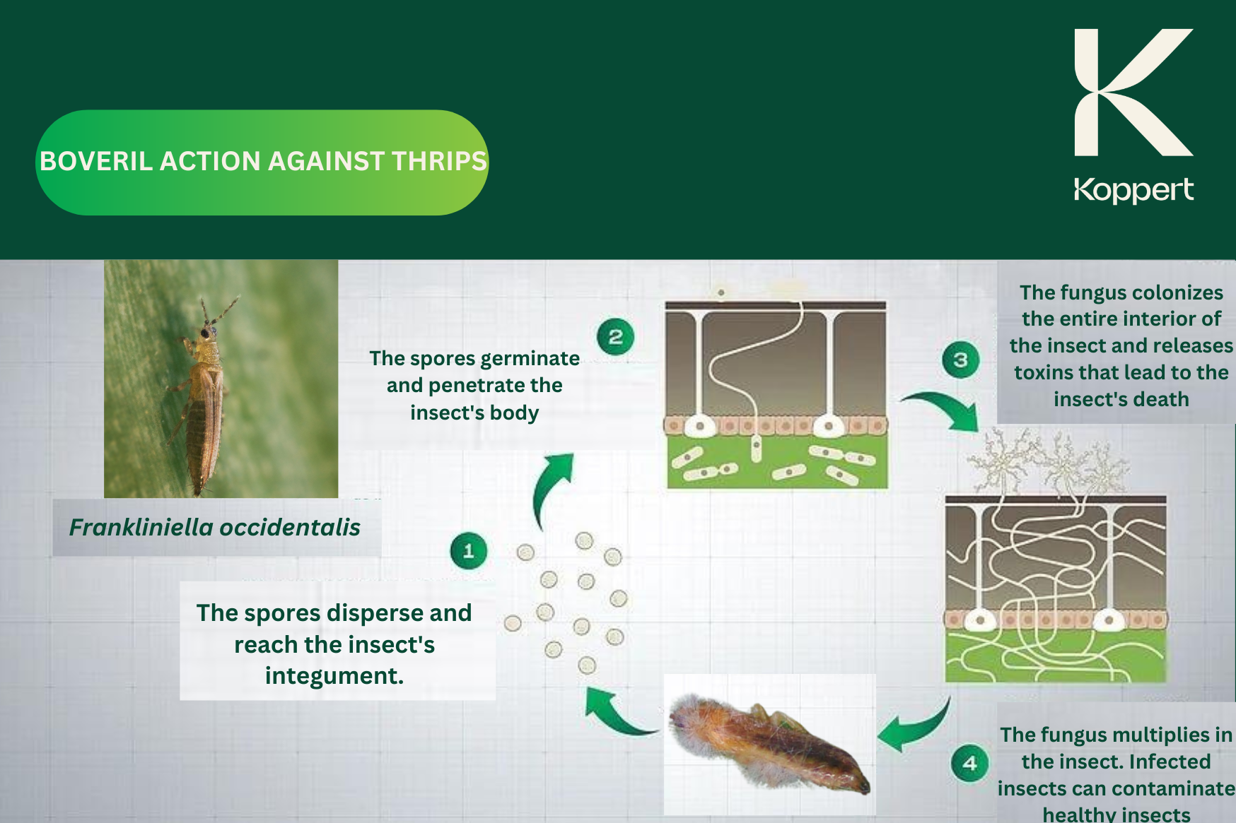 The microbiological insecticide Boveril is an insect pathogenic fungus, which acts on different stages of development of the hosts, such as larvae, nymphs, pupae and adults, with the following process: