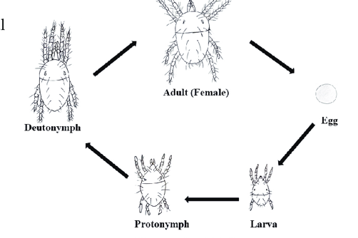 O. perseae has five developmental stages: egg, larva, protonymph, deutonymph and adult, and under optimum temperatures, it takes 10 days from egg to adult.